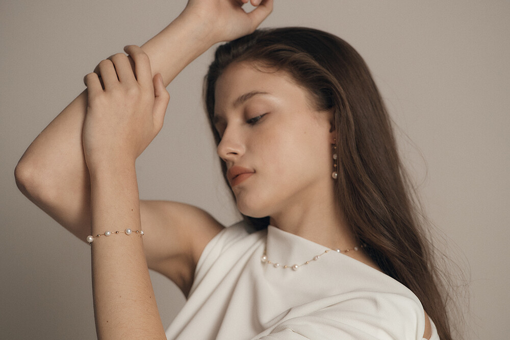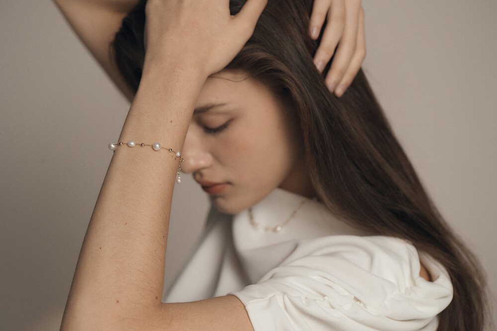 친환경 도금된 섬세한 스테인리스 스틸 체인과 담수진주의 은은한 빛이 조화로운 언제 어디서나 착용하기 좋은 팔찌 입니다.