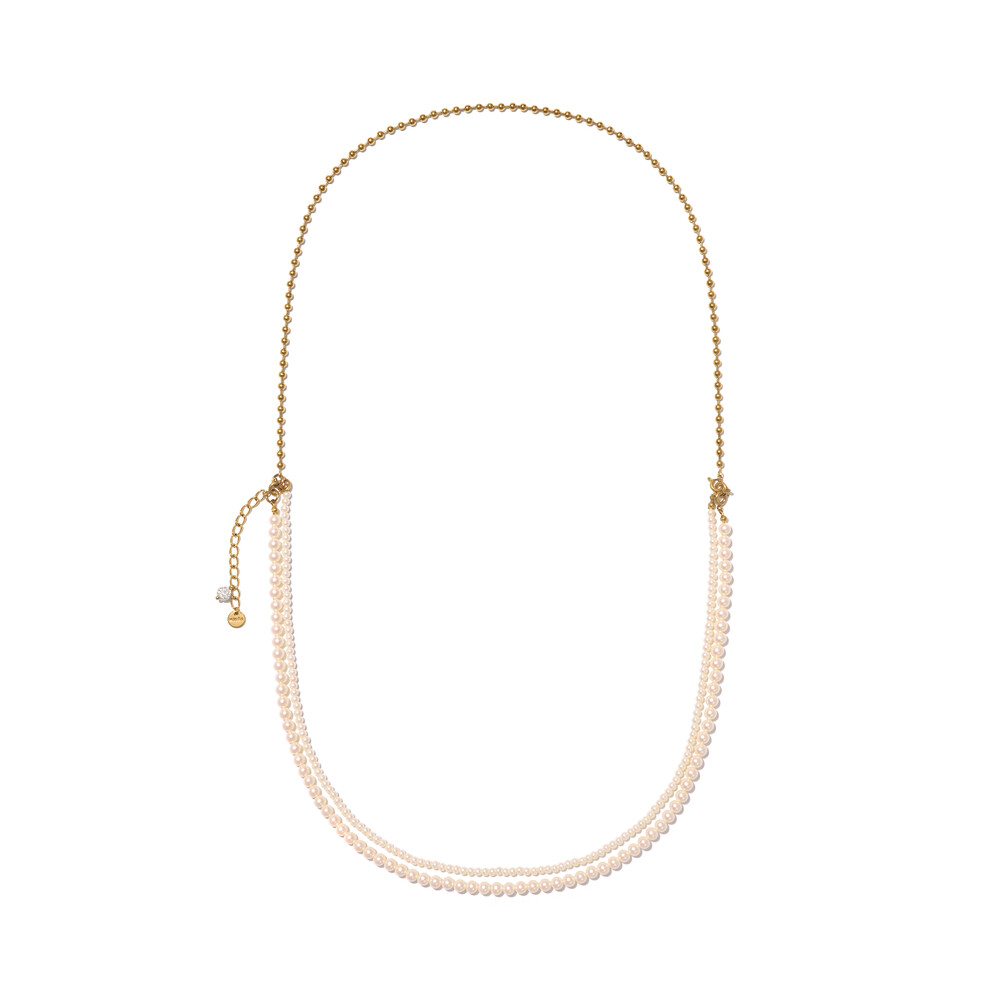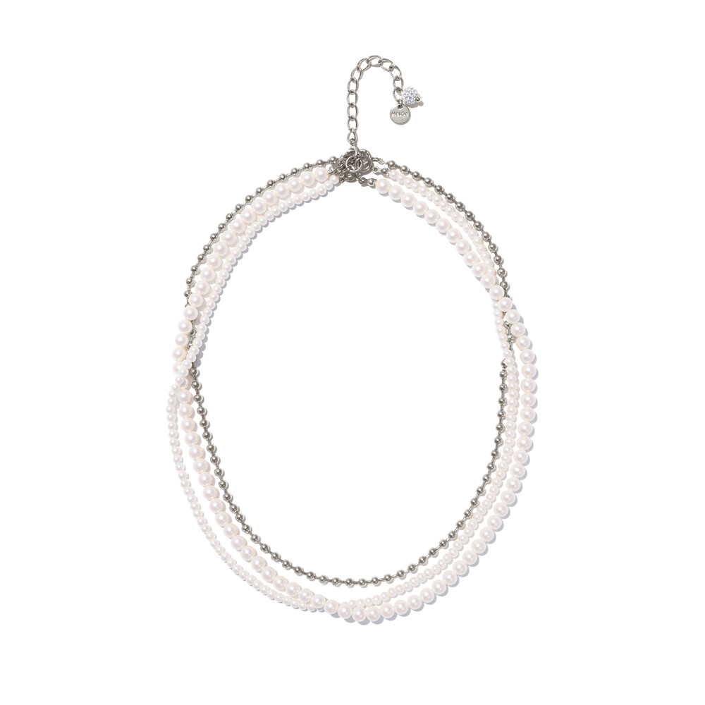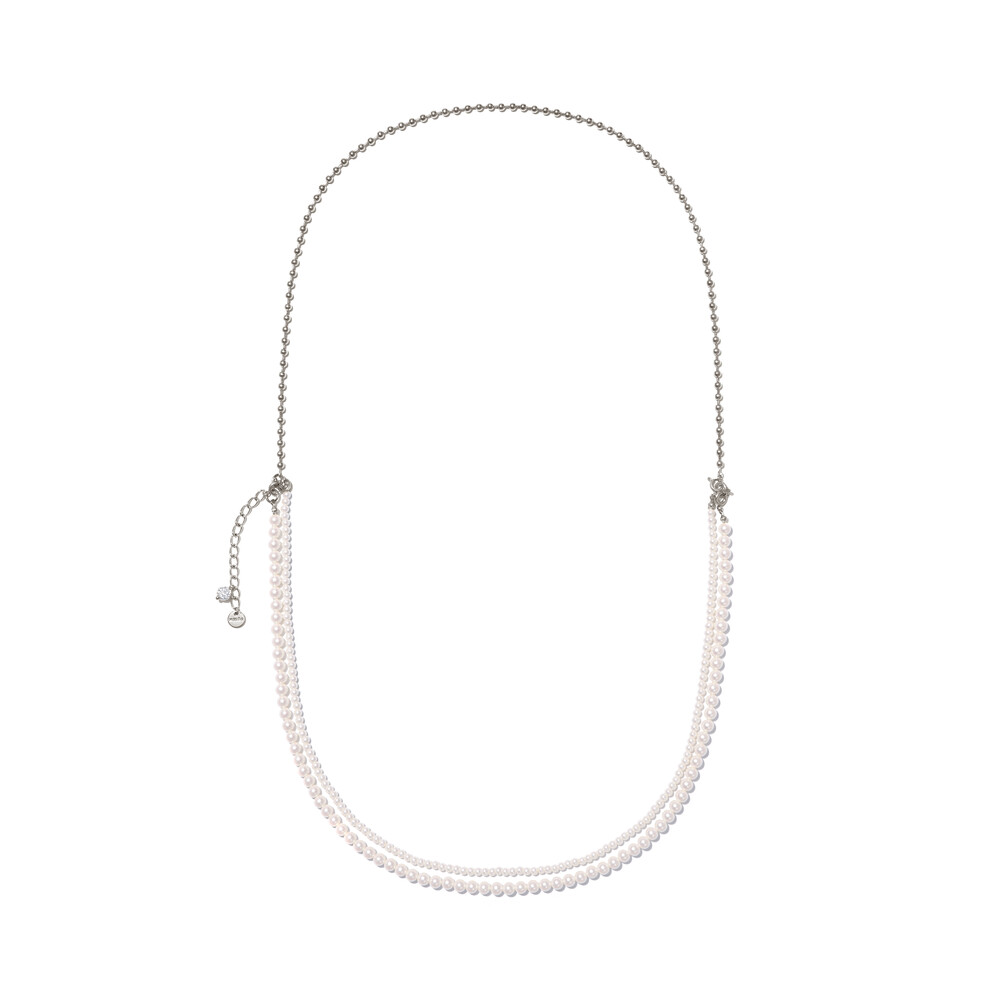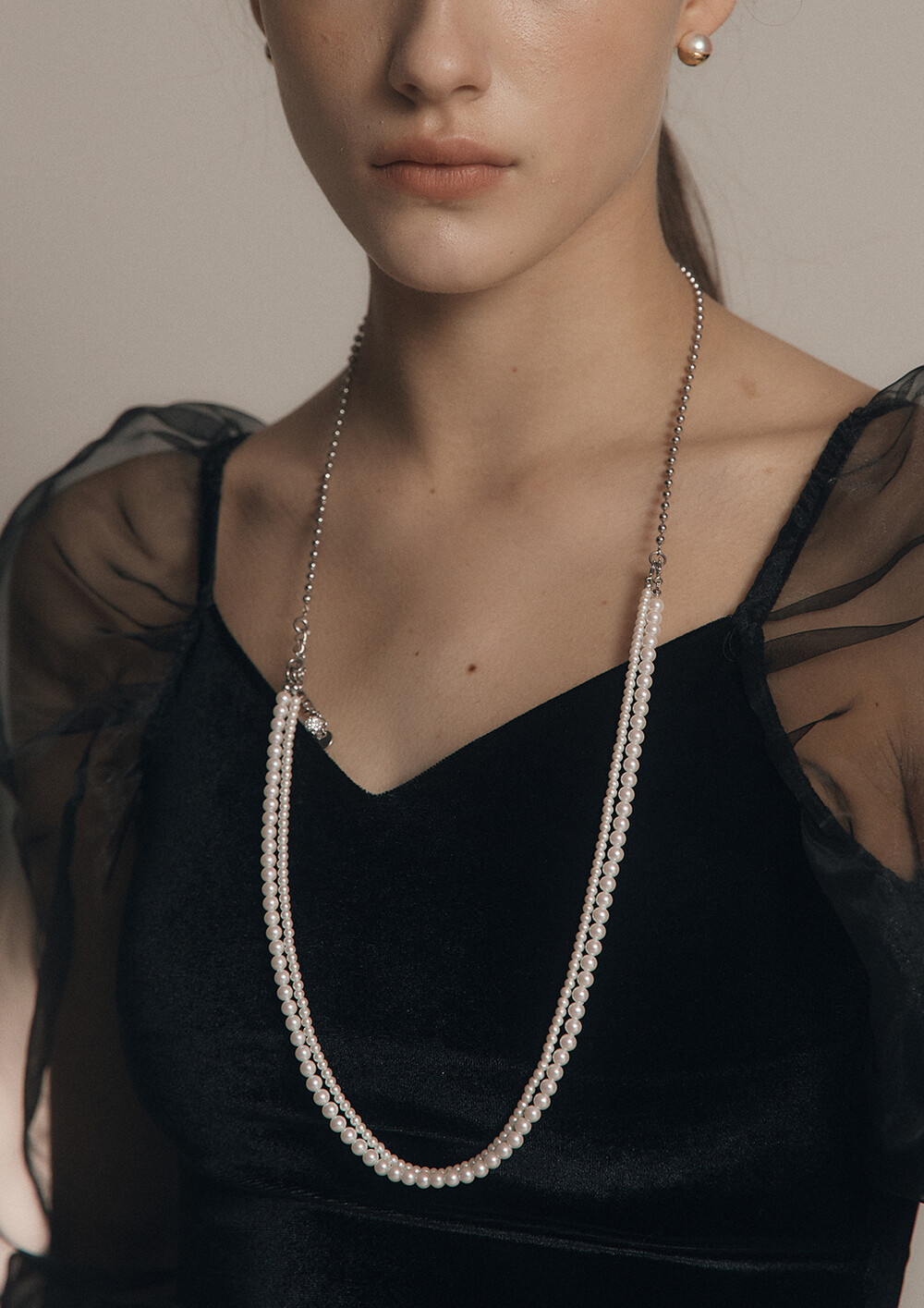 3MM 볼체인 목걸이와 3MM, 5MM 진주가 레이어드된 제품으로 여러스타일로 연출가능하며 분리하여 개별로도 착용이 가능합니다.