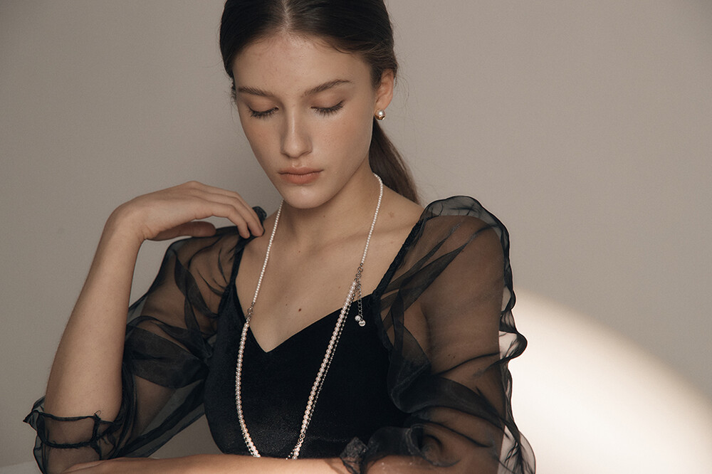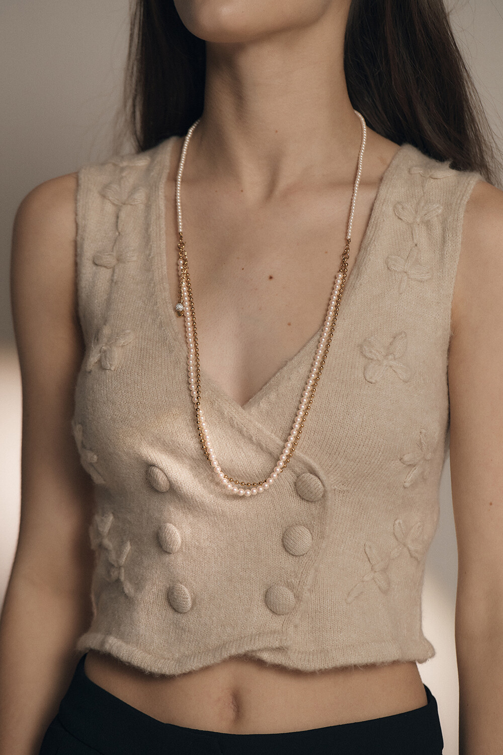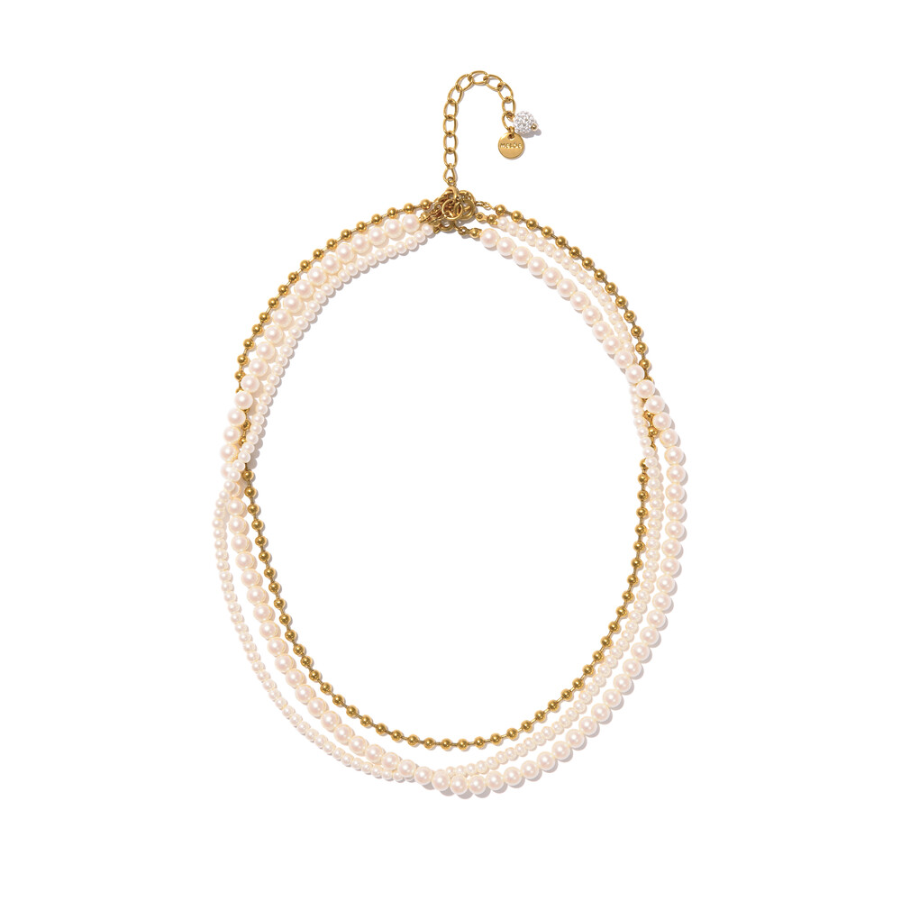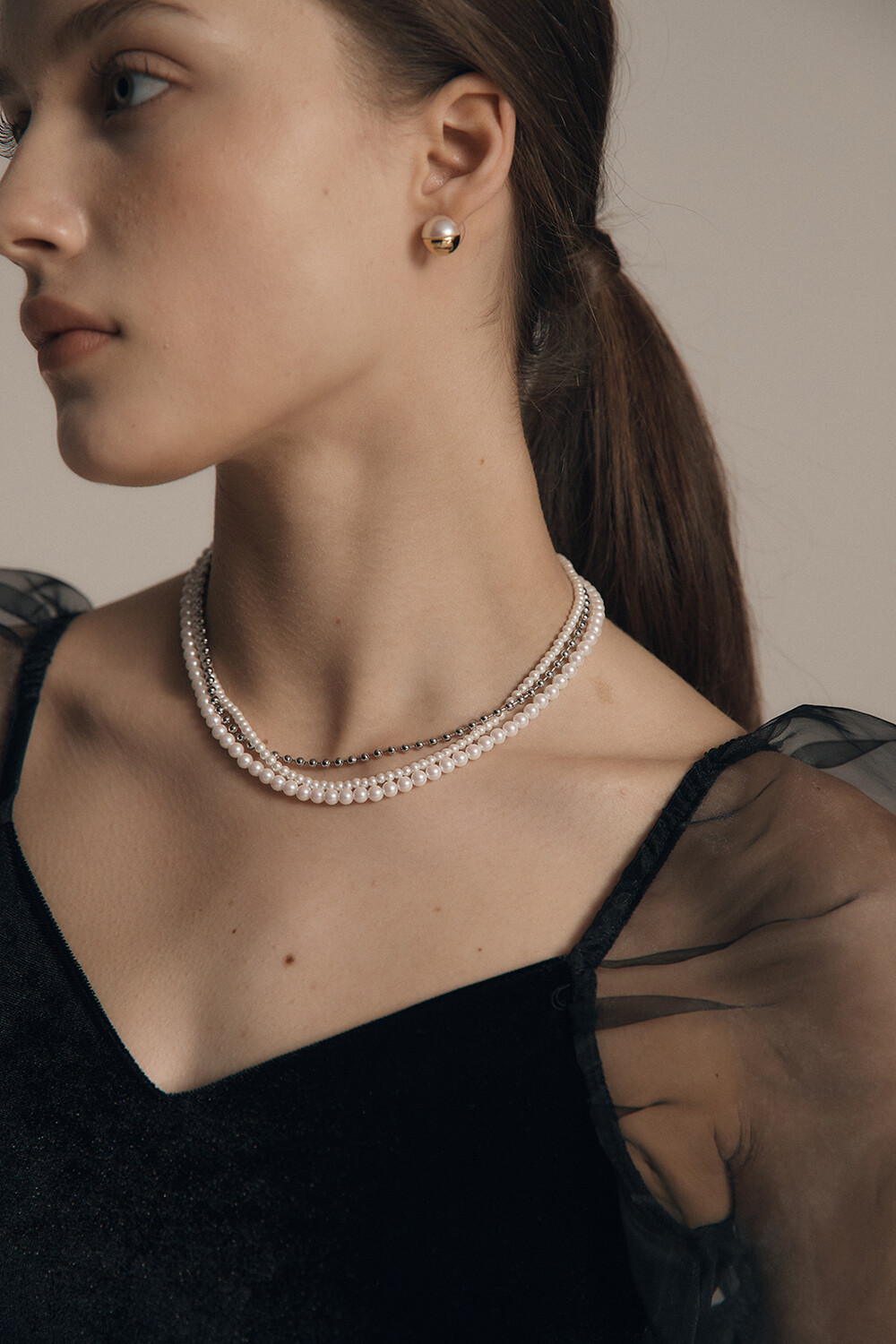 3MM 볼체인 목걸이와 3MM, 5MM 진주가 레이어드된 제품으로 여러스타일로 연출가능하며 분리하여 개별로도 착용이 가능합니다.