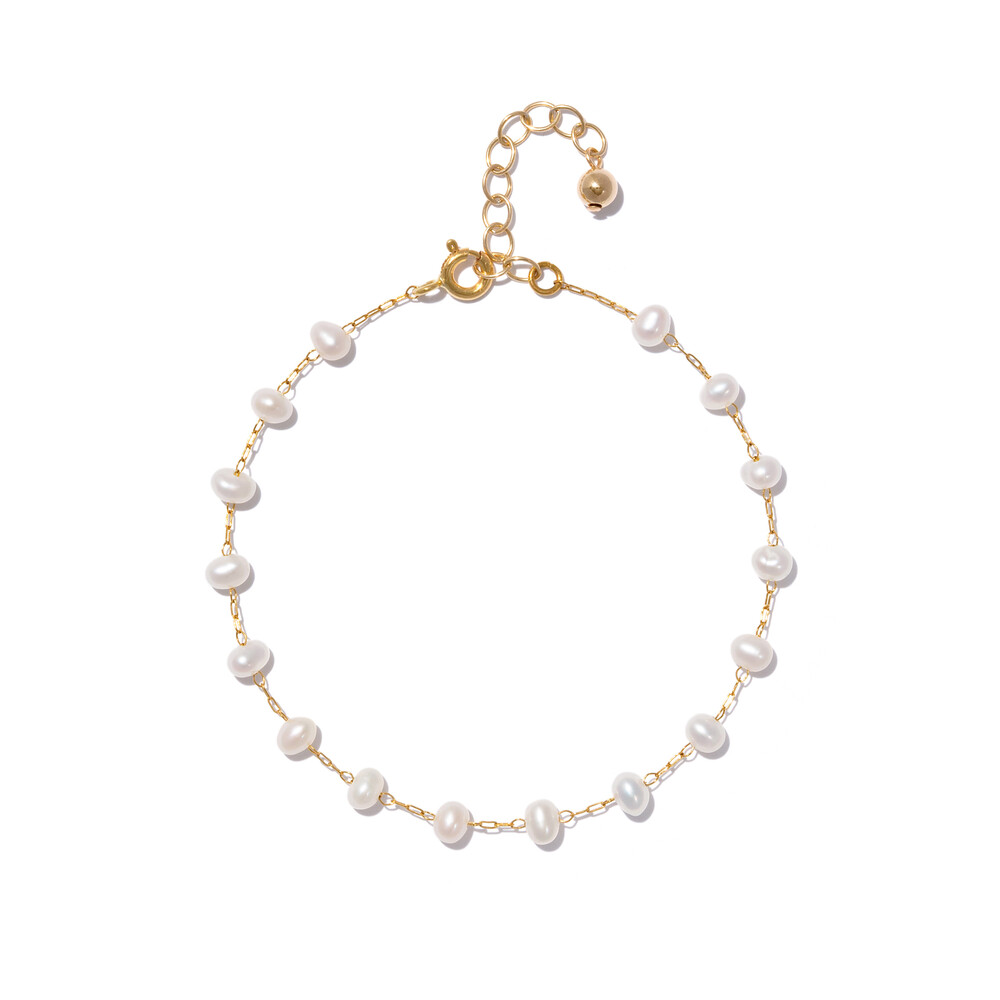 친환경 도금된 섬세한 스테인리스 스틸 체인과 담수진주의 은은한 빛이 조화로운 언제 어디서나 착용하기 좋은 팔찌 입니다.