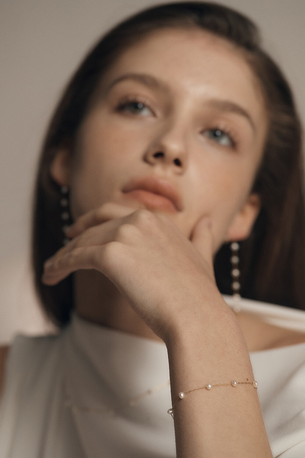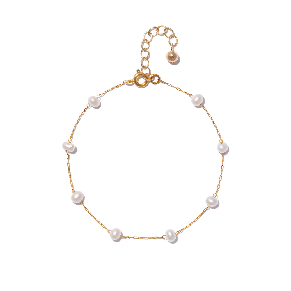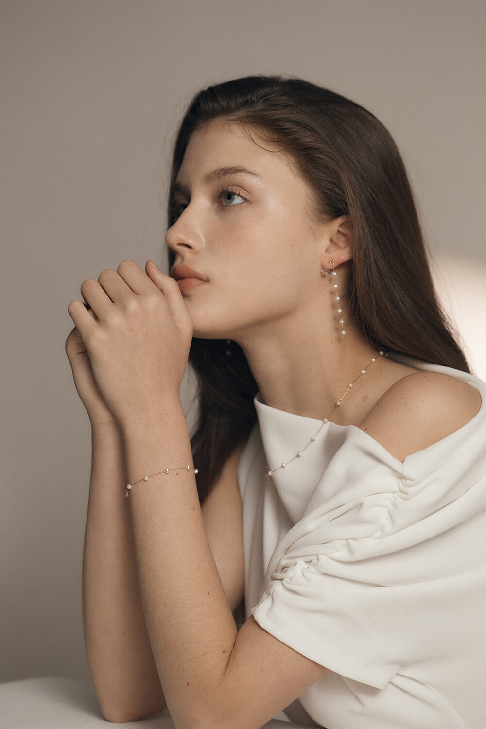 친환경 도금된 섬세한 스테인리스 스틸 체인과 담수진주의 은은한 빛이 조화로운 언제 어디서나 착용하기 좋은 팔찌 입니다.